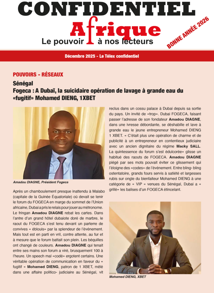 Hommage à un frère disparu – Moussa, je viendrai…Hommage à un frère disparu – Moussa, je viendrai…Forum Invest Sénégal: Une convention de partenariat stratégique signée entre la Banque Islamique du Sénégal et IFC ( filiale du Groupe Banque mondiale) Forum Invest Sénégal: Une convention de partenariat stratégique signée entre la Banque Islamique du Sénégal et IFC ( filiale du Groupe Banque mondiale) Sénégal: Macky Sall, l’impossible rêve onusien ? EXCLUSIF (Par Confidentiel Afrique)Sénégal: Macky Sall, l’impossible rêve onusien ? EXCLUSIF (Par Confidentiel Afrique)Guinée: L’illusion démocratique d’un référendum biaisé sur fond d’austérité financière et de pression sociale (Par Confidentiel Afrique)Guinée: L’illusion démocratique d’un référendum biaisé sur fond d’austérité financière et de pression sociale (Par Confidentiel Afrique)Sénégal-Mali: Basculement inquiétant du JNIM sur le dernier versant Est du corridor Dakar-Bamako. EXCLUSIF (Par Confidentiel Afrique)Sénégal-Mali: Basculement inquiétant du JNIM sur le dernier versant Est du corridor Dakar-Bamako. EXCLUSIF (Par Confidentiel Afrique)